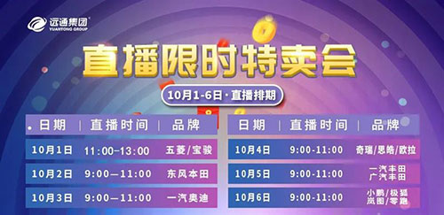 10月1日—6日,關(guān)注遠(yuǎn)通集團(tuán)抖音、快手官方賬號(搜索:YTQC0539),觀看國慶車展直播“限時(shí)特賣會(huì)”,留資并購車的粉絲,即可獲得直播專屬禮品一份,直播間還將狂撒紅包和購車福利。旗下品牌4S店也將同步舉行,讓你足不出戶在線看車展!