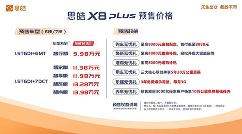 當(dāng)下隨著三胎的政策落地家庭用車需求大幅度增加,中大型SUV成為大多數(shù)用戶首選車型,在10月3日的遠(yuǎn)通車展思皓X8PLUS(圖片參數(shù)|詢價(jià))臨沂區(qū)域正式預(yù)售發(fā)布,共推出5款車型,定位中大型SUV,預(yù)售價(jià)9.98-13.98萬元。