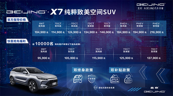 定位于純粹致美空間SUV的BEIJING-X7將以純粹空間、純粹設(shè)計(jì)、純粹科技、純粹安全四大領(lǐng)先優(yōu)勢,為用戶帶來全新的美好出行體驗(yàn)。此次上市的BEIJING-X7燃油車型共5款,官方指導(dǎo)價(jià)10.49萬元-14.69萬元。3款PHEV車型價(jià)格也同期發(fā)布。