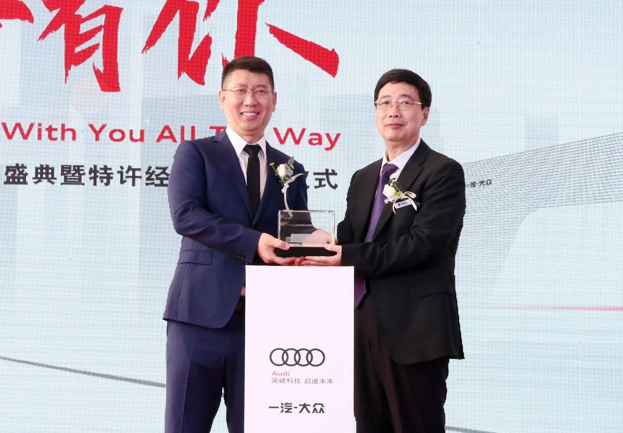 一汽-大眾奧迪銷售事業(yè)部東北區(qū)總經理葉華明將授權經營證書頒發(fā)給遠通集團董事長周昆
