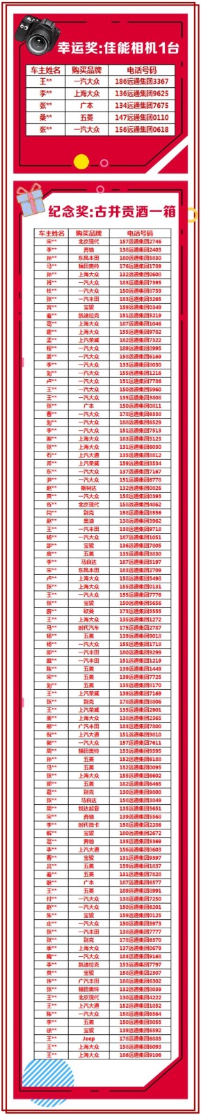 作為遠(yuǎn)通集團(tuán)疫情后的首次大展,今年的國(guó)慶車展的確是福利滿滿,車展8天,共有8名小伙伴喜中價(jià)值萬元的佳能相機(jī),160名小伙伴喜中價(jià)值千元的古井貢酒,還有超多預(yù)約看車展免費(fèi)領(lǐng)青花瓷的小伙伴。10月1日-3日的獲獎(jiǎng)情況已經(jīng)公布了(詳情看上期微信),現(xiàn)在看一下10月4日-8日的獲獎(jiǎng)名單: