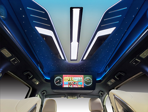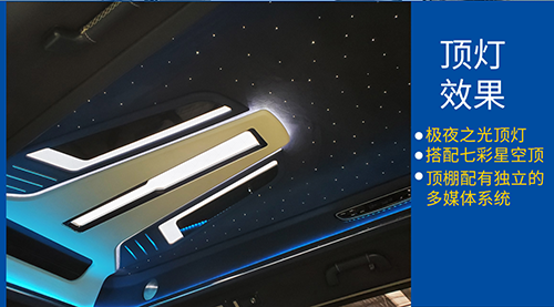 極夜之光頂燈搭配七彩星空頂,給你帶來極致的視覺享受。獨立的大屏影像系統(tǒng)讓旅途中不再寂寞。