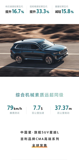 星越 L 是吉利汽車進入科技 4.0 架構造車時代,集全球資源打造的一款最新主流旗艦 SUV,使用了目前吉利汽車所有最好的領先技術,在世界級 CMA 架構技術的支持下,無論是三大件機械性能、智能科技體驗,還是選材用料、制造工藝都遠超同級產品。星越L這款車型完美詮釋了 CMA 架構“安全、健康、智能、性能、節(jié)能”五大全球基因,展現(xiàn)了 SUV 顛覆者的強大實力,重新定義了緊湊型 SUV 最高價值標準,將以顛覆者姿態(tài)引領時代前行。